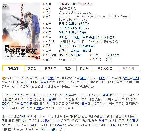 auto_awesome 애니메이션 인생 최종병기 그녀 [인생] 최종병기 그녀 01-13완결 [OVA 포함] -전쟁물 스릴러 액션 드라마- person 멋진인생 calendar_today 2026.01.01 visibility 5,296 다운로드 5개 파일 folder_zip Saishuuheiki Kanojo - 01 [BDRip 1920x1080 x264 FLAC].mkv 15.9G download folder_zip Saishuuheiki Kanojo - 01 [BDRip 1920x1080 x264 FLAC].smi download folder_zip Saishuuheiki Kanojo - 02 [BDRip 1920x1080 x264 FLAC].mkv download folder_zip Saishuuheiki Kanojo - 02 [BDRip 1920x1080 x264 FLAC].smi download folder_zip Saishuuheiki Kanojo - 03 [B download